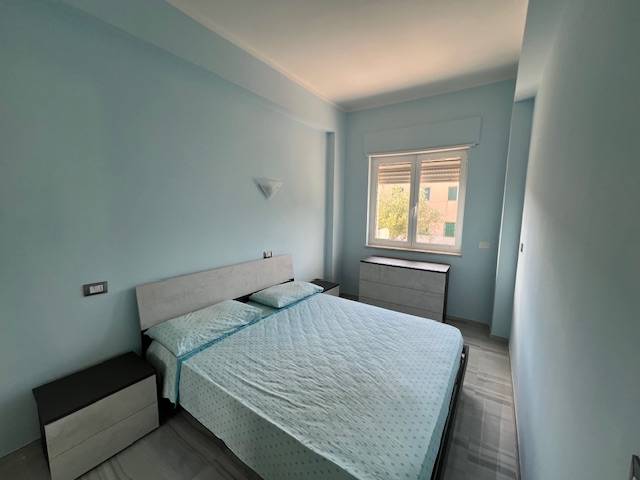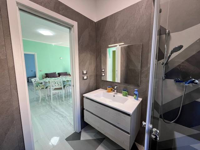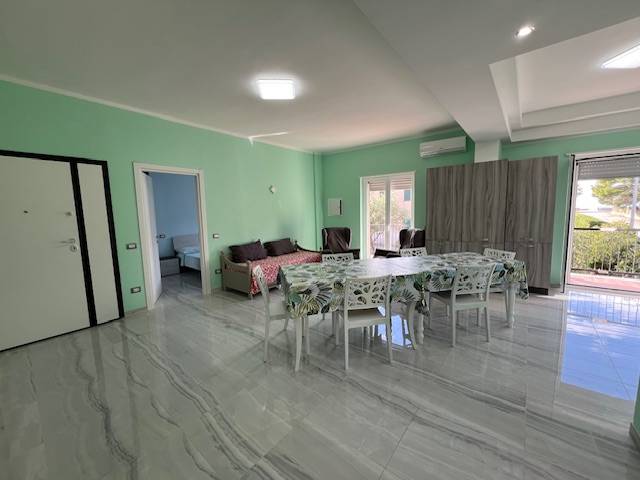 Composto da: ingresso soggiorno cucina con uscita sul balcone dal quale si intravede il mare, due bagni con doccia, disimpegno e tre camere da letto matrimoniali o doppie