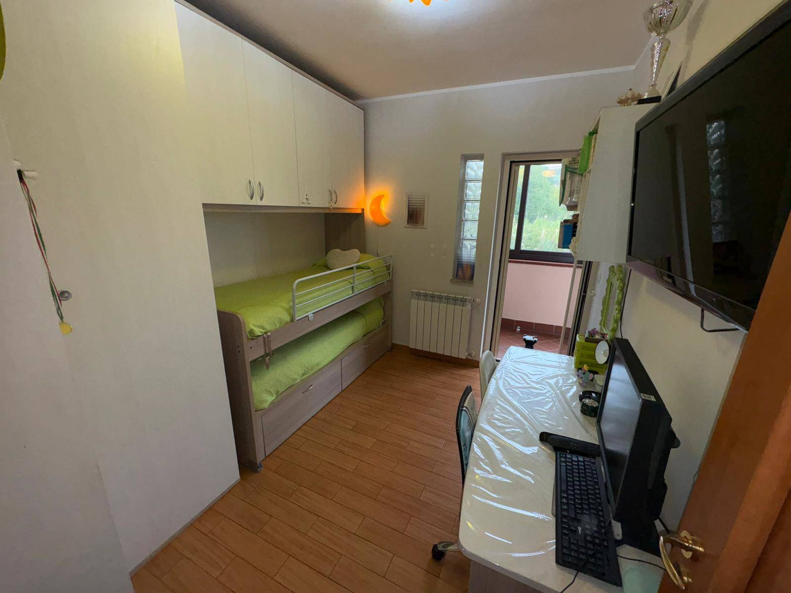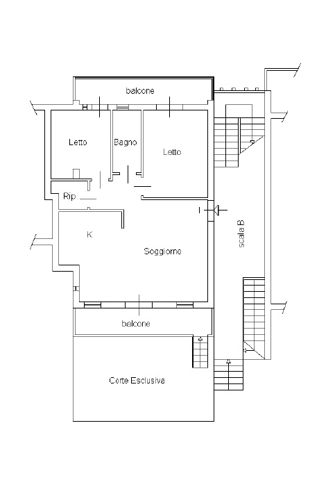 L’appartamento è composto da: zona giorno con ingresso- soggiorno, con cucina a vista (potrebbe comunque essere separata), entrambi si affacciano sul balcone, dal quale si accede alla corte privata, pavimentata e recintata, disimpegno, zona notte 2 camere da letto, con affaccio su un balcone verandato, bagno e lavanderia .