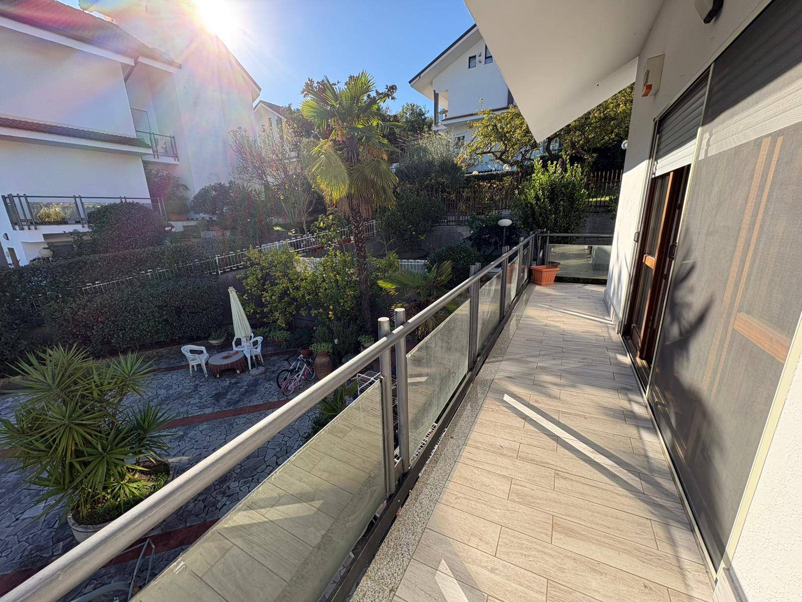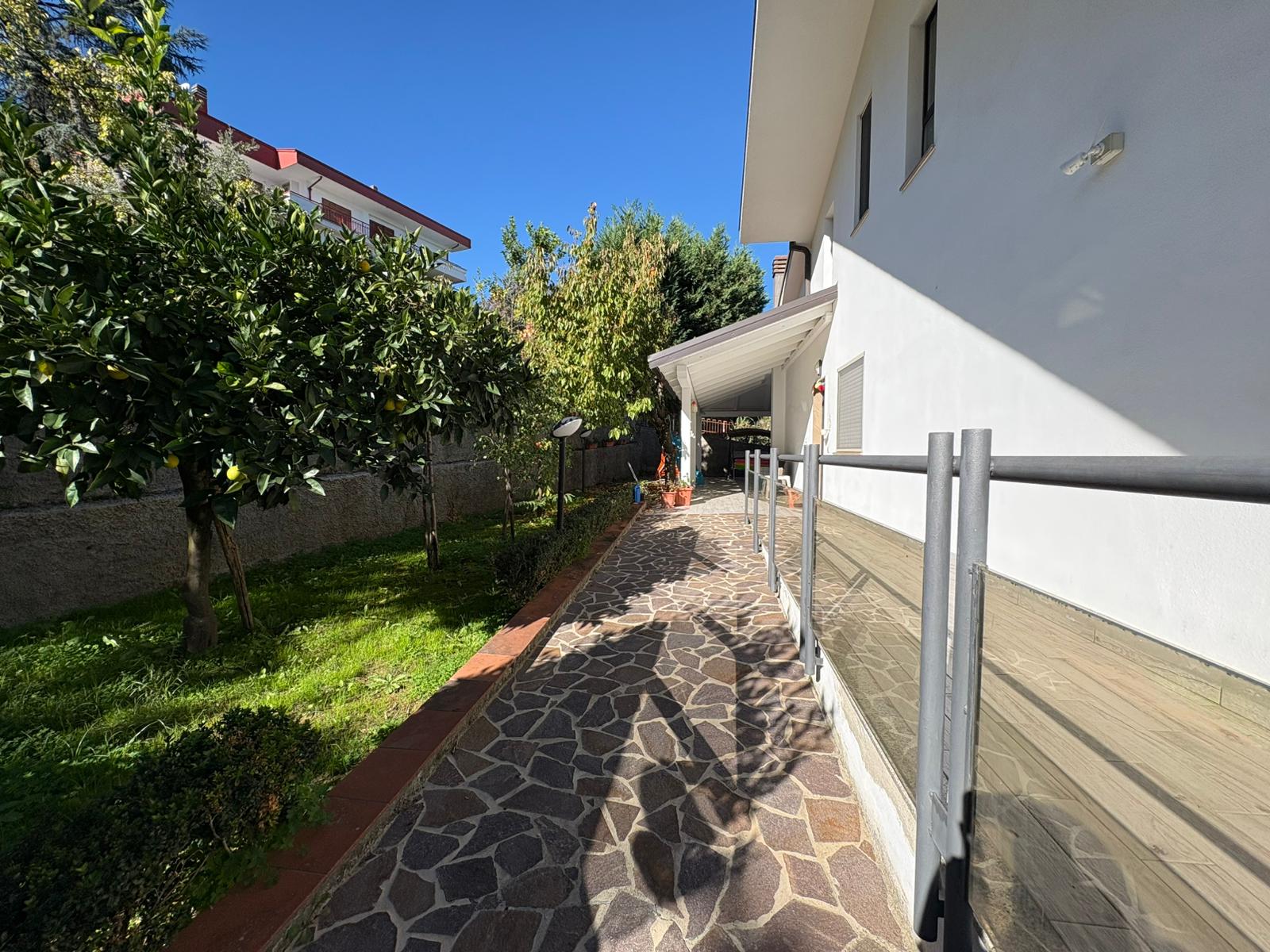 La villa dispone di un giardino di circa 400 mq, in gran parte pavimentato ma con aree dedicate a verde, alberi da frutto e zone ornamentali, ideale per vivere comodamente gli spazi esterni tutto l’anno.